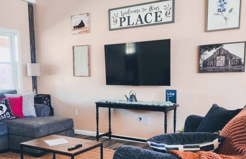 Our guesthouse sleeps 8 people very comfortably, possibly up to 10. We've worked very hard to make the Guesthouse an inviting and relaxing environment- from outdoor fire pits that overlook our small pond and sit in the shadow of Sinking Creek Mountain, to indoor amenities such as reading nooks, a bar with LED lighting & wine fridge, and a gameroom with a brand new shuffleboard table.