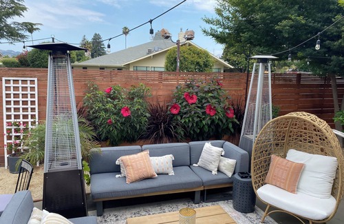 The house has a lovely backyard space where you can unwind and relax day or night. There is a church directly behind the house, so there are no rear neighbors on a regular basis. New 7 foot fence installed in 2023, providing excellent privacy. There is exquisite lounge/patio furniture, a small bistro table for outdoor dining, a hammock to relax and gaze at the stars, 2 outdoor heaters for chilly days or nights, a large umbrella for shade, and lighting for the entire space.