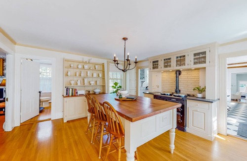 On the ground floor is the Cloud Room, named for its spectacular morning views of the unobstructed sky, and panoramic views of the apple orchard. It boasts a comfortable Queen-size bed, and is the only air-conditioned bedroom in the house, though the ocean breezes usually provide all the cool air you'll ever need. The Captain's Bedroom is the most spacious bedroom and offers convertible bed accommodations from a king to two twin XL beds upon request. Additional rooms are the Ship Mates Room, the Bunk Room, and the Hobbit Room, affectionally named for its uniquely small doorway which is common in old farmhouses. Two and a half baths provide the room needed for everyone's privacy, as well as soaking in the vintage claw-foot tub, pulled from a field in northern Maine and restored by the farm's previous owner, actor Patrick Dempsey!
