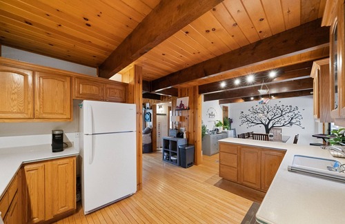 This family- and pet-friendly home is a serene escape, featuring cozy living spaces, a fenced backyard with a play dome, and a hot tub for soaking in the mountain air. Perfect for relaxation or adventure, it comfortably hosts up to six guests with three inviting bedrooms: a king master suite with a luxurious en-suite, a queen bedroom, and a twin room upstairs.