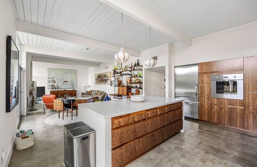 Originally designed by renowned mid-century architect William Krisel in 1960, this property has been added to by award-winning contemporary architect Jim Jennings from San Francisco to create something truly unique. Step into a world of elegance and charm, exuding a timeless aesthetic with art-filled walls and spacious interiors. Soak up the abundant natural light in the living area as large windows beautifully frame the breathtaking blue skies. Equipped with a Sonos sound bar, 50" TV, and gas fireplace—it's ideal for relaxation and entertainment. The newly renovated kitchen comes replete with high-end Viking appliances and added luxuries like a panini maker and French press. Gather at the 3-stool breakfast bar for a casual bite or dine in style under a contemporary chandelier at the 6-person dining table. A washer and dryer are hidden in the hallway closet near the fully redone bathrooms. Guests can retire to 2 guest bedrooms, one with a California king and the other a queen bed, offering captivating mountain views through clerestory windows. A primary bedroom, located on the opposite end of the home, features a custom California king bed, private bathroom, and access to a luxurious in-ground sitting spa. A spacious, covered patio extends from the house, with an outdoor living room and dining room underneath. Green grass, multiple sitting areas, and the most breathtaking mountain views from any vantage point flank the large rectangular pool. Additionally, the outdoor space offers a luxurious in-ground sitting spa for up to 12 guests and so much more.
