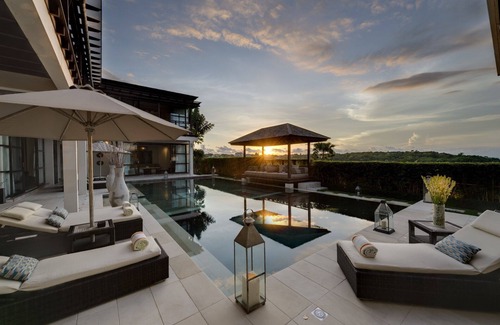 Set within the secure and exclusive Temple Hill estate, overlooking Jimbaran Bay, The villa is equipped with everything required for a truly memorable family holiday. Even its name a combination of the names of the owner’s three children reflects the consideration that went into creating this fabulously well-appointed family retreat. Children will adore the playroom, while adult and teenage guests will love the air-conditioned games room and entertainment den with its cornucopia of delights, including a pool table, 50-inch flat-screen television and PlayStation 3. A workout in the well-equipped gym or some zen time in the dedicated yoga space could be just what the doctor ordered, or perhaps a tension-relieving Balinese massage in the private spa treatment room? A state-of-the-art Bose sound system plays music throughout the villa, providing the perfect holiday playlist. Listen to some chill-out tunes whilst luxuriating on loungers shaded by capacious umbrellas or relax in the balé pavilion that hovers above the sparkling 12-metre swimming pool. Parents with youngsters can rest easy as the villa is equipped with a pool fence that can be erected to ensure the safety of little ones. And should a break from the tropical heat be desired, guests can slip indoors and savour the air-conditioned comfort of one of the many spacious living areas. Alfresco dining on the top terrace at The villa is an absolute treat: the villas private gourmet chef will prepare sumptuous meals which can be enjoyed at the twelve-seater dining table, or provide canapés to graze upon whilst sipping cocktails and lounging on the all-weather sofas as the sun sets magically over the ocean with Bali’s sacred Mount Batu Karu providing a mystical backdrop.