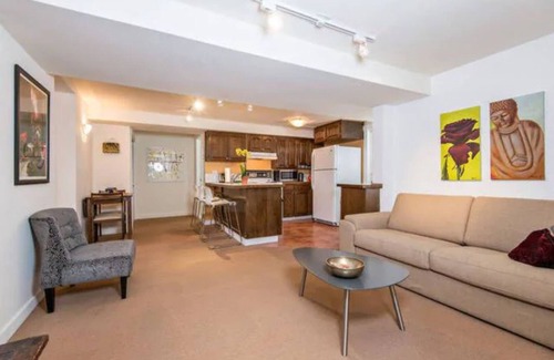 Private entrance to beautifully updated and maintained two bed, one bath on quiet tree lined street close ( five minute walk) to iconic Kitsilano beach. apartment is one hundred meters from ocean and two small parks. five minute walk to fourth avenue boutiques, restaurants and coffee shops. bus stop around corner to downtown vancouver and UBC. apartment has in- house laundry and a security system. comfortably sleeps four.