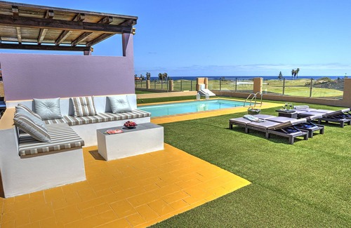 Villa Josefina, located in the fabulous Golf Course Salinas de Antigua (Caleta de Fuste), is located in the lower part of the complex. South facing. Near everything. Just 1 km from the Atlantic Mall. Enjoy fantastic views of the golf course and the sea. It is modern, luxurious and functional. Decorated with excellent taste has spacious and bright with 5 meter ceilings allow you to enjoy a wonderful relaxing stay.