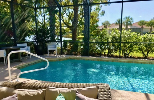 Beautiful Newly ReDecorated 1900 sq ft 3 Bedroom Air Conditioned Home with stunning southern facing lake view giving you Florida Sunshine all day. This home boasts a contemporary look with modern kitchen including stainless steel appliances, tile flooring, granite countertops, all utensils, coffee maker, microwave, toaster, formal and family dining that views the wide open view living area with 14' ceilings and open concept from the front door to the sliding lanai doors entering the large 16x30' pool and outdoor screened in entertainment/lounging/dining area. All bedrooms are tastefully decorated with hardwood flooring, the master having a king bed with large ensuite, and full bath. The guest bedroom has a queen bed with private full bathroom while the third bedroom doubles as an office with free wireless WIFI and a new very comfortable murphy bed. The living area boasts state of the art sonos entertainment center and smart TV, with all new modern furniture, just a few steps away from the outside living area. If golf is your thing, there are an additional 5 golf courses within 15 miles of Verandah. If the beach is for you, Ft. Myers Beach is 25 minutes away with many other beaches just minutes from there. If you have guests arriving by air, Southwest International Airport is 20 minutes away with easy access from I-75 HWY.