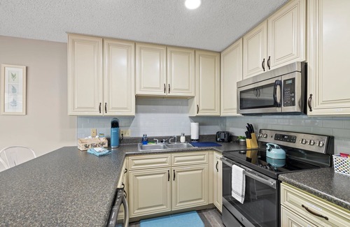The Living Room has a sectional with a tv and open space and large front window. That leads to the kitchen where there is a half bath off the kitchen. The Master has a king bed with its own private bathroom and workspace. The 2nd bedroom is equipped with two full beds with twins over each (bunkbed top beds recommended for kids over the age of 6 and weight limit of 250 pounds)