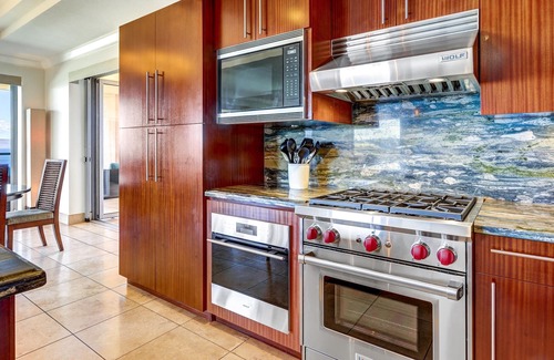 ‣ Kitchen: Fully equipped chef’s kitchen with high-end appliances, ocean view, and access to lanai