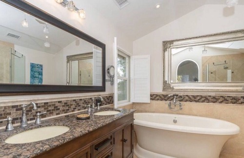 Welcome to our family retreat! Our resort style backyard is definitely a place you will enjoy! With the oversized hot tub, twinkling lights, bbq island to hang out as well as other chill spots to enjoy! Inside the home is amazing! We have a movie style theatre room with reclining sofas and 80 inch tv screen and a cute table to play games. The kitchen has all the amenities with breakfast bar and dining area. Family room with fireplace and another tv for watching while cooking and hanging out. 3 Full bathrooms ! Master has retreat with desk for quiet workspace and futon that can be opened for extra bed. The home is beautiful and located near wedding venues, wineries, hiking, beaches, amusement parks- everything So Cal and San Diego have to offer. Fallbrook is a quaint village with local farmers market and lots of restaurants and shops nearby. Come enjoy!