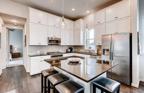 The full kitchen is located on the second floor and is stocked with a Keurig coffee maker, stainless steel appliances, enough utensils, and gadgets to cater to large groups including the kiddos. With custom cabinets, sleek counters, designer finishes, and a fully stocked coffee bar, it is as beautiful as it is functional.