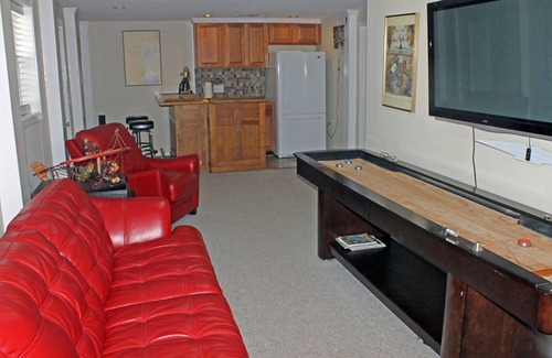 Lower level: contains a king master bedroom with whirlpool as well as a walk-in tile shower for two, a bedroom with a pyramid bed to sleep 3, a game room with pool table, shuffleboard, wet bar and a refrigerator, as well as a den with flat screen TV, gaming system, board games and leather furniture. There is also a laundry and a full hall bath on the lower level.