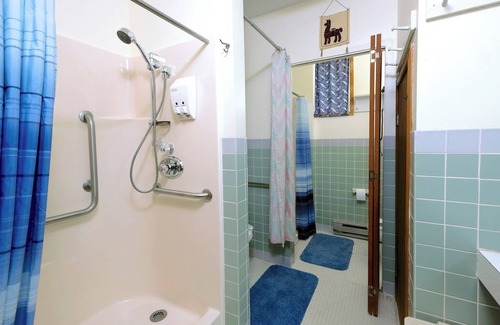 A few steps takes you to 4 bathrooms (6 toilets, 4 showers), a kitchenette, and a sky-lit living room with cozy futons, easy chairs, TV---plus a kids' corner with books, games and toys.