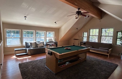 Nestled in the mountains, this beautiful cabin features 2 welcoming bedrooms with 2 queen beds. Guests will enjoy the high ceilings, views of the pine trees, and spacious deck. The loft area has futons for extra sleeping arrangements, a desk, and a 3-in-1 pool, ping-pong, and air-hockey table—instant indoor fun. Located on a quiet street with just a few other cabins, it’s perfect for relaxing, reading by the fireplace, sipping coffee on the deck, or heading out for a hike. You're sure to make fantastic memories with a stay at our place.