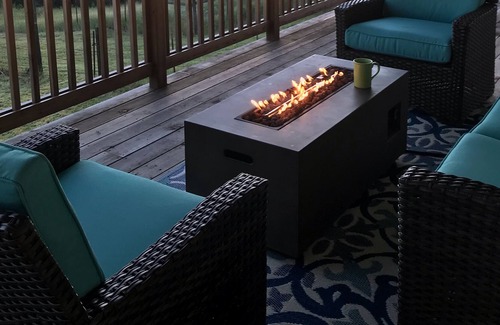 The outdoor living area is almost the same size as the house, it is the perfect place rain or shine. There are a few seating areas, one with a fire pit for chilly mornings and nights. There is a large dining table outside with bench seating and a bbq ready with propane and utensils to show off your grilling skills. The deck is great for rain or shine!