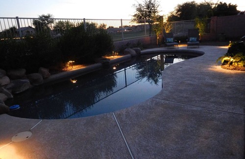 This home is located in the safe and quiet neighborhood of Coldwater Springs in Avondale, AZ. It backs up to the 10th hole of Coldwater Golf Club. 2100 sqft rambler with 4 bedrooms, 2 baths, living room (with a pool table), and open design kitchen/dining/family room. The interior has been newly painted and tiled throughout except the wood floors in the pool table room. There is a beautiful Pebble Tec pool in the private backyard that can be heated or cooled to desired temperature. The back patio includes table w/4 chairs, lounge chairs and grill.