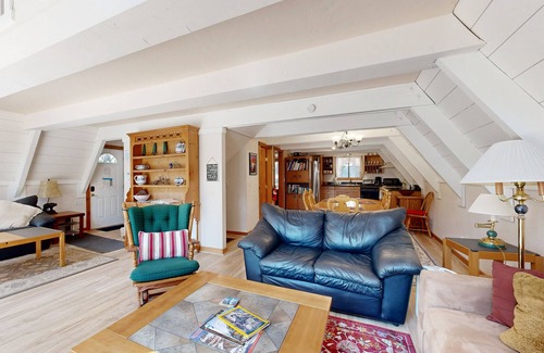 You'll be impressed by the unique look and the luxurious amount of space in this bright and airy A-frame. The living room features a gas fireplace where everyone can cozy up with cushions and pillows. While the kids play on the soft carpet, you can use the sound dock to stream music over the WiFi or watch a movie on the cable-equipped TV.