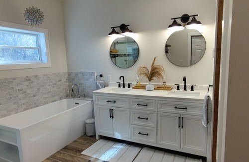 You’ll love the convenience of the master bath with double-sink vanity, soaking tub, walk-in shower, and bathroom essentials (hair dryer, towels, makeup towels, and more).