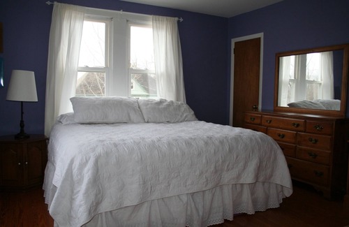Spread out in this spacious family home. The first floor has an easy flow from room to room and includes a sunny eat-in-kitchen with sit-down table and breakfast bar where family and friends have plenty of room to gather while meals are being prepared, a living room with TV/DVD player and basic cable, a dining room that seats 8+ and has a piano, and a family room with a cozy wrap-around couch. There is a half bathroom on the first floor. Enter the first floor through a large mud room with washer and dryer from the back side of the house or the comfortable front porch where you can grill on the gas grill and eat outdoors on the outdoor table that seats 8. From the dining room you can head up the stairs to the four bedrooms which share a full bathroom with a double sink. Two bedrooms have king beds, one bedroom has two full beds and one has one full bed. Each bedroom has three large windows to let in the sun and provides views of the lovely Castle Hill neighborhood. Several windows offer mountain views over the neighbors' roof tops. The house features large front, side and back yards for an in town property - great for relaxing in the lawn furniture or playing outdoors. The large paved driveway provides plenty of parking or a great place for kids to bounce a ball or ride bikes. Excellent high speed Internet available through WiFI. Window AC for bedrooms. Both bathrooms have been recently updated.