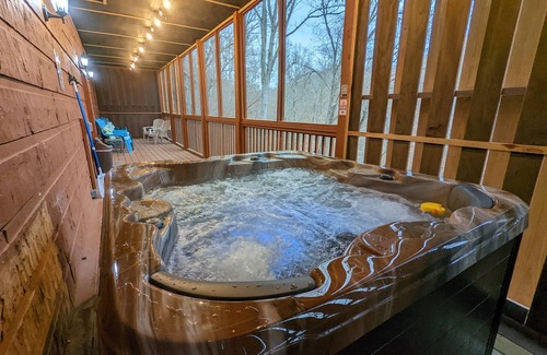 Head downstairs and you'll be greeted with all the toys and games to keep you entertained during your trip. A full size ping pong table, foosball, retro arcade cabinets and a virtual pinball tables, 4K home theater with surround sound, a game/poker table, gas fireplace, small refrigerator for drinks and a sitting/reading area all encompass the downstairs rec room. A new infinity table with boardgames, chess, puzzles, coloring and more will keep the kids and adults entertained. The back deck off the rec room is screened-in to keep the bugs away and has a brand new hot tub surrounded by privacy walls. The mini fridge down here is convenient to keep beverages cold and close without having to go upstairs to the kitchen. The small workspace lets you plug in a laptop right next to the WiFi router. The gas fireplace allows you to stay warm in the winter while watching your favorite movie in 4k surround sound.