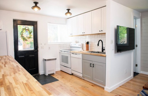 The cabin features a big yard with an outdoor fire pit and seating that may be used in the summer/fall (typically May-October) when there are not burn bans. There are two bedrooms and one bathroom with a walk in shower. The living room features a TV with access to Hulu & Netflix. The cabin is stocked with all of the essentials you should need during your stay including basic toiletries, towels, linens, and cookware. There is also a small beverage station featuring coffee, tea and hot chocolate.
