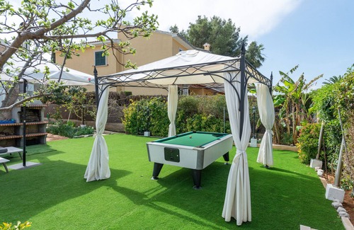 Welcome to Bon Aire!! Our Villa "Llimona" of 180 m² comfortable and fully equipped. An unforgettable vacation awaits you here, where you can enjoy the tranquility and beauty of the Bon Aire sea.The house is tastefully decorated with attention to detail.The kitchen is complete and offers plenty of space for cooking and spending time with family and friends.There are 4 large bedrooms with plenty of space for 8 people.The large terrace with barbecue invites to cozy dinners with family or friends and the pool is a good size and invites the whole family to play and splash around.There is air conditioning in all rooms for the best possible comfort.It is located 300 m from the restaurant "Restaurante Cocodrillo", 350 m from the restaurant "Chill out Restaurant 5 Oceanos", 400 m from the supermarket "Bonaire (only May - October)", 500 m from the rocky beach "Cocodrillo", 600 m from the bus station "Stop Bonaire Cocodrillo", 2 km from the sandy beach "Manresa San Juan", 2 km from the sandy beach "Sant Pere", 2 km from the sandy beach "S´Illot", 3 kmIt has a garden, garden furniture, fenced plot, 150 m² terrace, barbecue, iron, safe, internet access (Wi-Fi), hairdryer, heat pump heating, air conditioning, private pool, open-air parking in a nearby building, Television, satellite tv (Languages: Spanish, English, German).The independent induction kitchen is equipped with a fridge, microwave, oven, freezer, washing machine, dishwasher, dishes/cutlery, kitchen utensils, coffee maker, toaster and kettle.The tourist tax (€2.20 / night / adult) is not included in the price and must be paid in cash upon arrival.