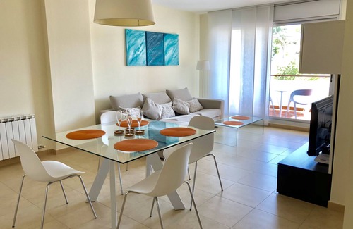 1 living room and dining area: Equipped with TV(42”, Amazon Prime & Netflix), chaise-longue, coffee table, dining table and 4 chairs. There are French windows that open out onto a spacious balcony (8m²) with a table and 6 chairs for eating outside.