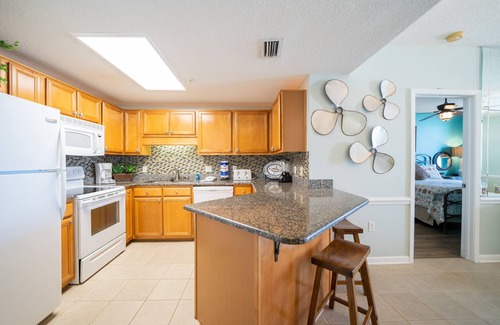 Bedroom two has a pair of full-size beds and a flat screen television with an attached bathroom. In the kitchen are all of the quality major and minor appliances that you can use to make everything from snacks to gourmet meals.