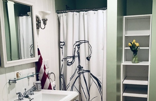 The “Clam shack” has a deck as well as a futon inside and chairs to use outside on the lawn or down by the water. A set of stairs will take you to the waterfront for a quick dip or to enjoy the rocky shore. There are even perfect rocks to jump off at high tide.