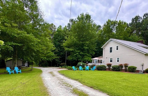 Escape to our peaceful farmhouse just 2 miles from downtown Burgaw. Nestled among acres of woods, our fully updated home offers a retreat for up to 9 guests. Enjoy the sound of birds as you relax on the outdoor deck or gather around the fire pit under the stars.