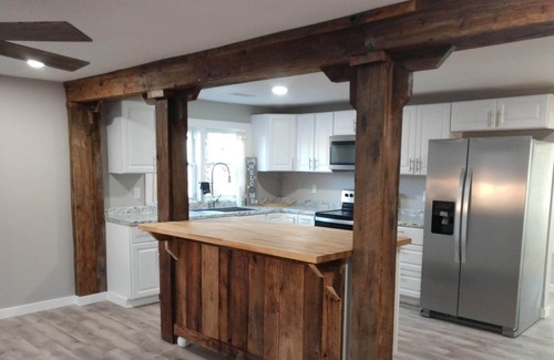 This fully remodeled farmhouse has rustic charm and reclaimed barn wood from the property. It will invite you to get cozy in the living room, enjoy sweet conversations while preparing food and drinks in the open kitchen & island area, or sip a cup of coffee on the front porch, and watch your furry friend (or kids) run around in the fully fenced-in front, side, and backyard. The rest of the property is fenced-in pasture land that invites the deer and other critters to wander through. Sit back and relax, and enjoy a piece of heaven on earth while you stay at the Not-so-Far-Away Farm. Two bedrooms and two full baths offer enough space for a couple of adults to enjoy. There is a pull out sleeper sofa as well. A laundry room/mud room is easily accessed through the back door or main hallway. The yard is set up for pets (dogs), and they are more than welcome! Sit outside and enjoy the night sky without the city lights to interfere. Enjoy the gentle rolling of the train as it meanders through the countryside on its way to places near and far away. This property is best suited for a long vacation (30 days or more) or a traveling professional/s who needs to be in one location for a month or more.