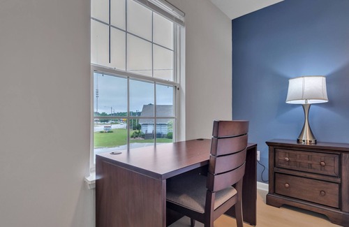 Step into your haven and discover two inviting bedrooms, each featuring a plush queen-sized bed with nightstands and lamps for late-night reading. Get some work done or plan your Fayetteville adventures at the designated workspace complete with a desk and chair in each room. Ample storage is provided with a closet in each bedroom, ensuring a clutter-free stay.