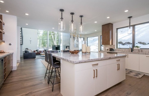 Expansive floor-to-ceiling windows paint this 2-story alpine sanctuary with an ethereal wash of natural light and offer pristine views of the snow-dusted woodlands. Deluxe furnishings and a stately fireplace create a sumptuous space to spend an evening with friends, family, or a best-selling novel in the open great room. Quality entertainment is a click away with a 65” Samsung TV and Sonos sound system. On the opposite end, a lavish kitchen made for hosting transforms every culinary task into a euphoric experience adorned with elegant stone counters, and top-of-the-line appliances—including a Bertazzoni 5-burner stove and wine fridge. A natural gas grill is conveniently located nearby for an après ski BBQ feast. Savor a delectable meal with a bottle of wine as conversation flows at the adjacent 8-person dining table, or grab Sunday brunch from the generous kitchen island that seats 5. A spacious mudroom makes preparing for an outdoor adventure a seamless process, and there is a laundry room for convenience. A well-appointed office with a Murphy bed grants guests a peaceful retreat to check emails or plan the next day’s adventure. The spacious primary bedroom provides endless indulgences with a private balcony and hot tub.