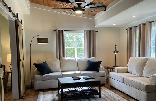 Welcome to our centrally located, small farmhouse with high style, high tech, and plush comfort. We are freshly furnished, and fully remodeled with high wood-beam ceilings and an open concept living-dining-kitchen area. Two cozy bedrooms, a living room featuring custom barn doors and deep couches; and a media room with a wow-worthy 85” tv. Our kitchen is well appointed and fully equipped. 472 Finley is a very short walk from Lincoln Way restaurants and shops, yet only minutes from hiking, biking and whitewater options on the river. Enjoy your morning coffee on us, while relaxing in a swing chair under a giant oak, in our large open back yard stretching all the way to Auburn’s train tracks.