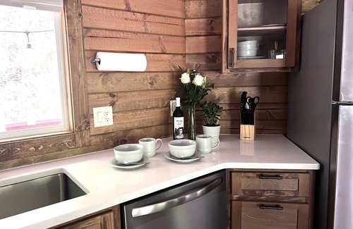 Behind the sitting area is the fully equipped kitchen with plenty of cabinetry, a refrigerator/freezer, dishwasher, microwave, gas range, and oven. Guests will have everything for easy meal prep and can enjoy a meal at the table for two in the living room or outside on the deck.
