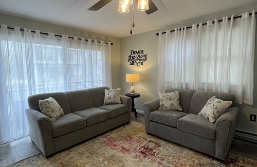 This first-floor, 3 bedroom/1.5 bathroom unit is newly renovated with new appliances, furniture and flooring. The first bedroom has a queen size bed and full size bathroom located directly across the hall. The second bedroom has two twin side beds, and the third bedroom has another queen size bed, Smart TV and half bathroom. The living room has a loveseat, couch, accent chair and Smart TV. The dining room table seats 4-6 people and 2 people at the countertop. The kitchen has all your necessities- the owner provides a separate ice maker on the kitchen counter, as well as stackable washer/dryer, dishwasher and refrigerator. Parking for 2 (or 3 smaller cars) is located on the right side of the house.