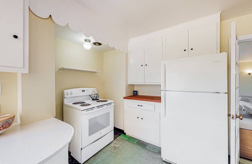 The property is made up of two separate retreats. The main house presents unique charm that can be noticed through the small details like warm wood flooring, built-ins, and crown molding. Sit back and enjoy the comfort of the living room's ample seating and lovely views, or head for the rooftop deck where you can be one amongst the trees. Steps away, the home's full kitchen exudes a sense of retro charm with its checkered flooring. When mealtime rolls around, dine with your loved ones at the quaint breakfast table or at the expansive formal dining table.