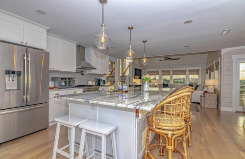 The open, airy floor plan will accommodate a family of 12 easily. A large eat-in kitchen with large granite center island accommodates 6 and dining table for 6 more. All stainless steel Jenn Air appliances, and grey and white granite counter tops with ship lapped walls offer a wonderful coastal designed escape. The living room flows from the kitchen with electric fireplace, and souring ceilings. A L-shape sectional with accent chairs will complete this area, perfect for family gatherings. A smart 65" TV completes this area.