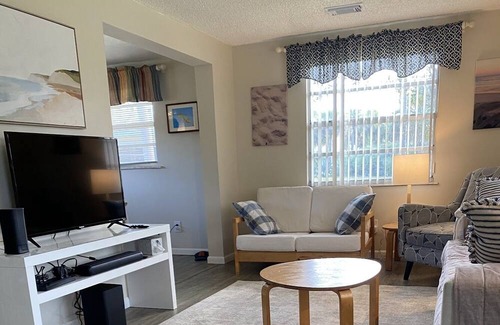 The home includes three bedrooms and two full baths. The primary bedroom ensuite was just completely renovated with large tiled shower and new vanity; updated main bathroom has a combined tub/shower. Primary and one guest room both have queen beds with new mattresses -- one memory foam, the other standard innerspring. Third bedroom has two twin sized beds. Home recently redecorated with new living room and dining room furniture; kitchen recently fully renovated. Large laundry room includes new large capacity washer and dryer. Smart TVs in living room and primary bedroom. Home is modest but clean, cute and cozy with a relaxed beach feel.