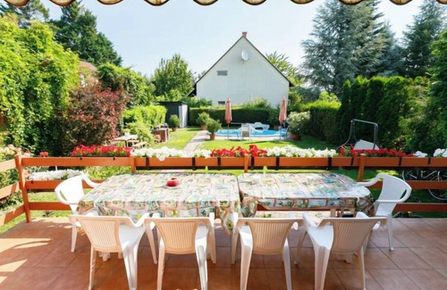 Balatonalmádi 15 km from Balatonfüred: Beautiful house "Flamingo". In the resort, 500 m from the centre, 200 m from the lake, 850 m from the beach. Private: garden (fenced), lawn for sunbathing, swimming pool kidney shaped (13 m2, depth 120 cm, seasonal availability: 01.Jun. - 20.Sep.). Barbecue, fireplace. In the house: WiFi, air conditioning. Available: bicycles (5). Grocery 500 m, supermarket, restaurant 600 m, bakery 1 km, café 800 m, bicycle rental 1 km, railway station 2 km, grass beach 900 m, indoor swimming pool 4 km, thermal baths "Hévíz" 81 km. Sailing school 1 km, tennis 1 km, riding stable 3 km, cycle lane 100 m, children's playground 700 m. Nearby attractions: Balatonfüred 16 km, Tihany 21 km, Veszprém Zoo 16 km, BalatonBob Theme Park 9 km, Annagora Aquapark 16 km, Balaton Golf Club 23 km. Please note: railway line closeby.