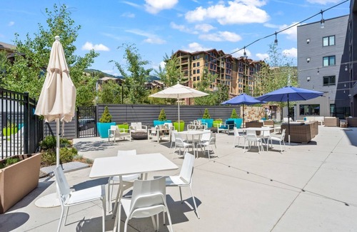 YotelPad Community Amenities: Valet parking and ski valet with easy access to the gondola and chair lift, Grab-n-Go (for a charge) with snacks and beverages, skier’s lounges, and a communal fitness center when you want to get a quick workout in. There is a game room with skee ball, video games, pool table, and shuffleboard table, with access to an outdoor patio with outdoor sofas, fire tables, and great views. In the rear of the building are additional outdoor spaces with comfortable seating and fire tables, a year-round heated pool and hot tub, and mountain views. There is a ski room on the back patio where you can pick up your equipment and head to the slopes. When you need a quiet space to get some work done, there are small private rooms or a reserve a larger conference room when more space is preferred.