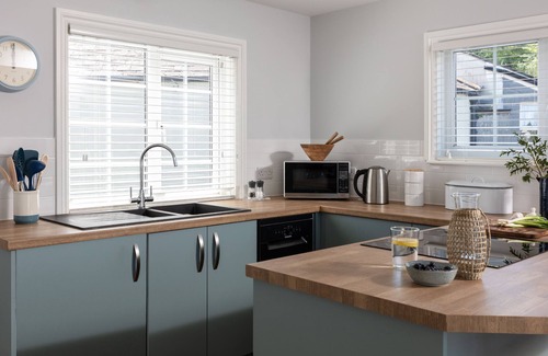 The well-equipped kitchen has everything you need including a breakfast bar and comfy chairs. Spend time together cooking up freshly caught fish for dinner or enjoying a glass of locally produced wine.
