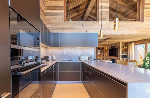 The kitchen is fully equipped with high-end appliances. The granite workspace offers a generous setting for cooking after a day of skiing.