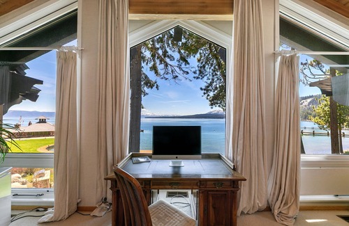 The primary suite is a true lakefront sanctuary. This bedroom is positioned right at the water's edge and offers an unmatched connection to Lake Tahoe. Wake up to the sight and sound of gentle waves lapping the shore, visible through expansive picture windows that frame the lake in all its glory. Enjoy the wood fireplace while basking in the view and the remote workstation offers a relaxing place to keep up on your to-do list. The spa-like en-suite bathroom features a deep jetted soaking tub, a double vanity, and a large walk-in closet, creating the ultimate space for unwinding in style.