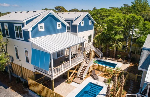 Newly constructed in 2019 and thoughtfully designed for large groups, Retreats on Hudson is a one-of-a-kind triplex in the heart of Folly Beach. With 10 bedrooms, 8 full bathrooms, 2 half baths, and 3 private heated saltwater pools, this coastal retreat sleeps up to 22 guests and offers the ultimate blend of privacy and connection.