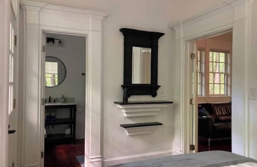 A 600 s.f. cottage retreat designed by Robert Phillips. One bedroom, full bath and kitchen and spacious living room. 10 ft. ceilings and fine architectural details; terraced; fountains nestled in a tree grove on 10 acres & foot paths. 15-20 minutes to Chapel Hill/Carrboro, University of North Carolina; Pittsboro and the Saxapahaw arts community on the Haw River.