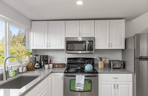 Forest Heights is a delightfully stylish, slightly boho, sunlit wine country getaway. This wonderfully renovated home gives guests plenty of room to spread out. The cozy covered porch entry leads into an open living and dining floor plan with vaulted ceilings, plenty of natural light, and updated kitchen. Upstairs is the main living area with two bedrooms and a full bathroom, kitchen, and hot tub deck. Downstairs is a separate suite (exterior stairs), with bathroom, bedroom, office space, and outdoor lounge with gas-firepit.