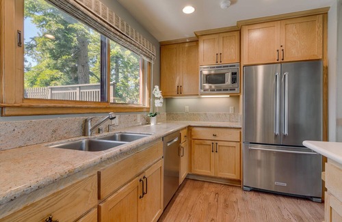 Tahoe Luxury Properties welcomes you! Forever Edgewood is the quintessential, family vacation rental home with a sunny open floor plan that promotes unity, a spacious top level for the kids and a large back deck with a hot tub. A feeling of comfort emanates as soon as you walk through the doors. New furnishings, hardwood floors and colorful art grace Forever Edgewood with comfort and style throughout. Crisp linens, fresh white towels and warm designer blankets also create a cozy environment in which to relax.
