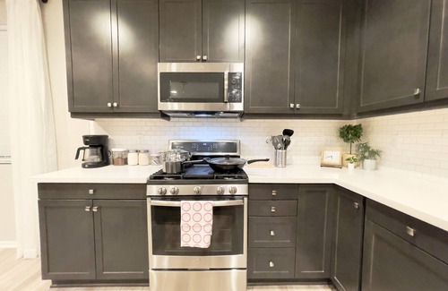 Our 4BR/2BA home was Richmond American's model home till end of 2022. It offers a fully stocked kitchen with brand new appliances, mid-century modern furnishings, Australian imported leather sofa bed, AC, laundry room, smart TV, fireplace, fast mesh network WiFi, bamboo pillows, day bed with trundle, LoveSac bean bag, professionally landscaped yard, extended patio dinning, bowflex gym, parking garage, etc.