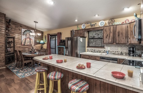 As you turn into the driveway of Fort Getaway you’ll see a log-style swing and a bonfire area amid the front yard’s Ponderosa pines. That’s just one of the many charming features that make this three bedroom cabin such a delightful home base for your Ruidoso vacation.