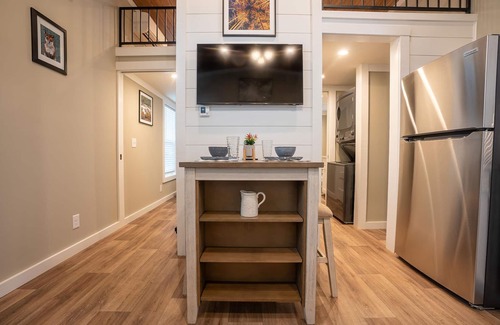 Indoors you will find a tiny space that embraces modern luxury. Fox River has an open living space with comfortable seating, large flat screen tv with streaming services, highspeed internet, a fully stocked kitchen with stainless steel appliances, a small dining space, private bedroom with queen bed and flat screen tv, and a private bath with stand up shower. Fox River features an additional loft sleeping space with King Size bed. This unit offers a stackable washer and dryer for guest usage.