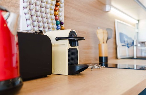The kitchen-living room has an open plan kitchen (2 ceramic hobs and hood, top fridge with freezer compartment, dishwasher, wine cellar, microwave, Nespresso coffee machine, kettle, toaster) with bar and high stools, a sofa-bed (130x190), a flat screen TV and storage space.